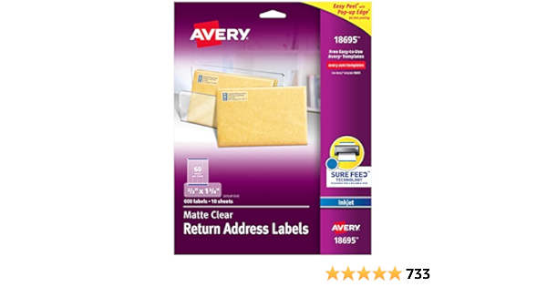 Avery Return Address Labels, Matte Clear, 2/3" x 1-3/4 ... - Walmart.com 88695 Color Clear Manufacturer Avery Products Corporation Assembled Product Weight 0.316 lb Assembled Product Dimensions (L x W x H) 12.09 x 9.44 x 0.13 Inches Warranty Warranty information Avery provides a satisfaction guarantee for orders and use of Avery's website, software and templates with genuine Avery products and materials.