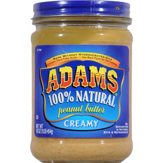 Adams ® 100% Natural Creamy Peanut Butter Nutritional Information. About. Fresh roasted peanuts and a dash of salt are the only ingredients in Adams 100% Natural Creamy Peanut Butter. With no added sugar, no preservatives, and no trans fat, you'll love it on toast, with fruits and veggies, in smoothies and recipes, and even just straight out of the glass jar. Available sizes: 500 g, 1 kg.