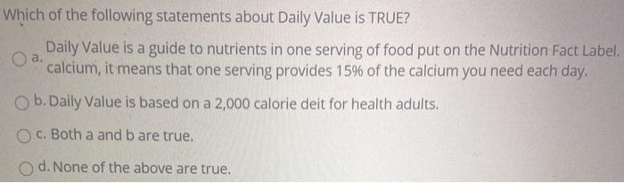 What does daily value mean. Value Change Definition - Investopedia The term value change refers to a daily adjustment made to the price of a company's stock. This change reflects the number of outstanding shares issued and currently held by investors. This figure... The Lows and Highs of Percent Daily Value on the Label The percent Daily Value (%DV) shows how much a nutrient in a serving of food contributes to a total daily diet. The %DV can help you determine if a serving of food is high or low in a nutrient. The... What Does “% Daily Value” Mean on a Food or Supplement ... In a nutshell, the % Daily Value is a guide to the nutrients in one serving of food and are based on the Dietary Reference Intake guidelines established by the Institute of Medicine of the U.S. National Academy of Sciences. The current Dietary Reference Intake recommendation is determined by weighing the following factors: The Complete Guide to Recommended Daily Intakes, Daily Values, and ... The most popular and common of these in the U.S. is the Daily Value or (%DV). This is the percentage that you see on all nutrition facts labels. In addition to this, there is the Reference Dietary Intake (RDI), and Tolerable Upper Limit (UL) that any person should consume. What is the difference between the RDI and DV?