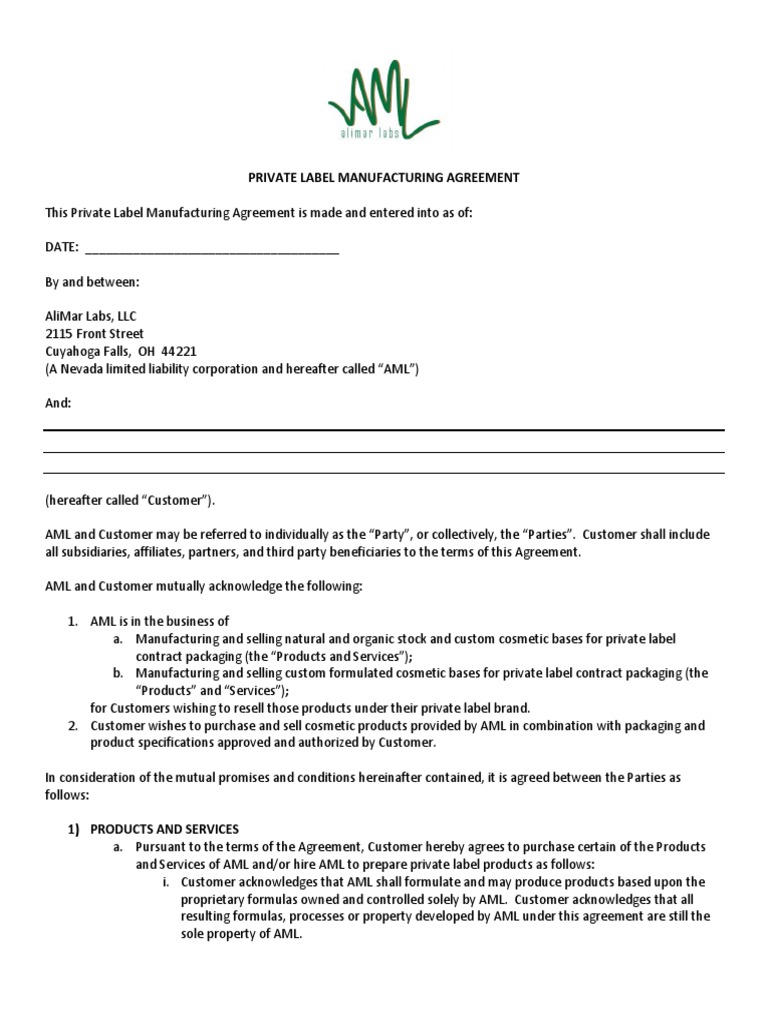 PDF Komodo White Label Reseller Agreement authorized, non-exclusive white label reseller of the Product Units in the Territory during the Term, and Reseller hereby accepts such appointment. (b) License Grant. Subject to the terms and conditions of this Agreement, Licensor hereby grants to Reseller a non-transferable, non-exclusive, non-sublicensable license that may be solely exercised Private Label Manufacturing and Supply Agreement - Sec this private label manufacturing and supply agreement (this "agreement") is made as of this 15th day of april, 2012 (the "effective date"), by and between mpact environmental solutions, llc., a corporation organized under the laws of south carolina and having its principal place of business at 400 south main street, fountain inn, sc 29644, … A complete guide on private label agreement (template included) - Tan Do 6 Key Ingredients to a Successful Private Labeling 1. Intellectual Property The most critical part of a private label agreement is acknowledging that the manufacturer upholds the ownership of the product recipe or formulation after the conclusion of the production run. 2. Period of the agreement 13 Free Sample Private Label Agreement Templates Private Label Agreement Guidelines Follow our simple and easily understandable guidelines before jotting anything down on the paper. Make sure you cover the points we are going to discuss at first. Mention complete names of both the companies in capital letters and you may highlight it too for better and standing out vision.