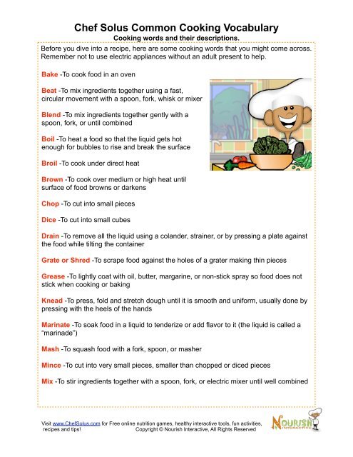 What's cooking with Chef Solus has recipes with kids steps ... 21 Sept 2015 — We want to make it easy for you to cook with kids and this is one more step ... So if you haven't been in our What's Cooking with Chef Solus ... Chef Solus and the Food Pyramid Adventure Game Materials The Chef Solus game works very nicely as a complement to the New My Plate. Although the symbol for healthy eating has changed, all the information and color schemes for the food groups are exactly the same. The Food pyramid serves as a great story adventure as the kids enter the pyramid and explore while creating healthy balanced meals and ... Chef Solus Meal Games - Nourish Interactive Chef Solus Meal Games. See all our games! This is Chef Solus' kitchen where he does all his wonderful cooking. He loves teaching his explorers all about healthy meals and good kitchen habits. Kevin and Ashley were visiting Chef Solus in his kitchen one day when they noticed a special plate that was seperated into different colored sections.