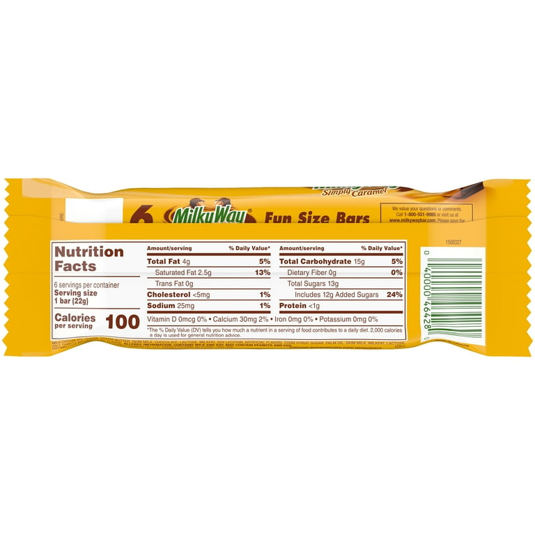 Milky Way Fun Size Simply Caramel Chocolate Bars, 10.73 oz Contains one (1) bag of individually wrapped milky way simply caramel fun size bar (10.73-ounce bag) A caramel lover's dream. milky way simply caramel is made with real milk chocolate surrounding a rich and delicious caramel center - no nougat. Delicious whether unwrapped and enjoyed or incorporated into dessert recipes!
