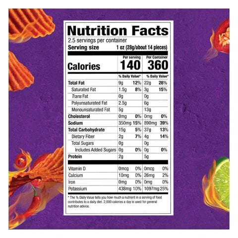 8 Best Healthy Chips of 2022 Sep 22, 2022 · Here’s the nutrition info for a 1-ounce (28-gram) serving of the Red Bell Pepper flavor : Calories: 90; Carbs: 11 grams ; Protein: 3 grams; Fat: 4 grams; Fiber: 4 grams; Sodium: 110 mg;