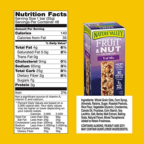 Nature Valley Wafer Bars, Peanut Butter Chocolate, 1.3 oz, 5 ct ... Nature Valley Crunchy Granola Bars, Oats & Honey and Peanut Butter, 48 ct. Sponsored. $10.98. ... Refer to the product label for full dietary information, which may be available as an alternative product image. ... * The % Daily Value (DV) tells you how much a nutrient in a serving of food contributes to a daily diet. Calories per gram: Oats and Honey Granola Bars | Oat Bars | Nature Valley Nature Valley Oats 'n Honey Crunchy Granola Bars are a tasty snack made with whole-grain oats and a touch of honey. A portable snack perfect for the pantry, lunch box, and hiking trail. There are no artificial flavors, colors or high fructose corn syrup, and these snack bars pack an excellent source of whole grains with 22 grams per serving! Nature Valley Granola Bars Nutrition Label - This Nutrition Nature Valley Granola Bars Nutrition Label Published on: 06/11/2020 | Last Updated: 07/04/2021 Learn more information about nature valley granola bars nutrition label. Nature Valley Crunchy Granola Bars - Almond Butter Macro Nutrition ... Keto & Health Insights for Nature Valley Crunchy Granola Bars - Almond Butter. Net Carbs are 13% of calories per serving, at 23g per serving. This meal falls within the range for standard keto diet guidelines (at or under 25g of net carbs). If your daily net carb quota is 25g and if this food almost equals that much, consider whether you're ...