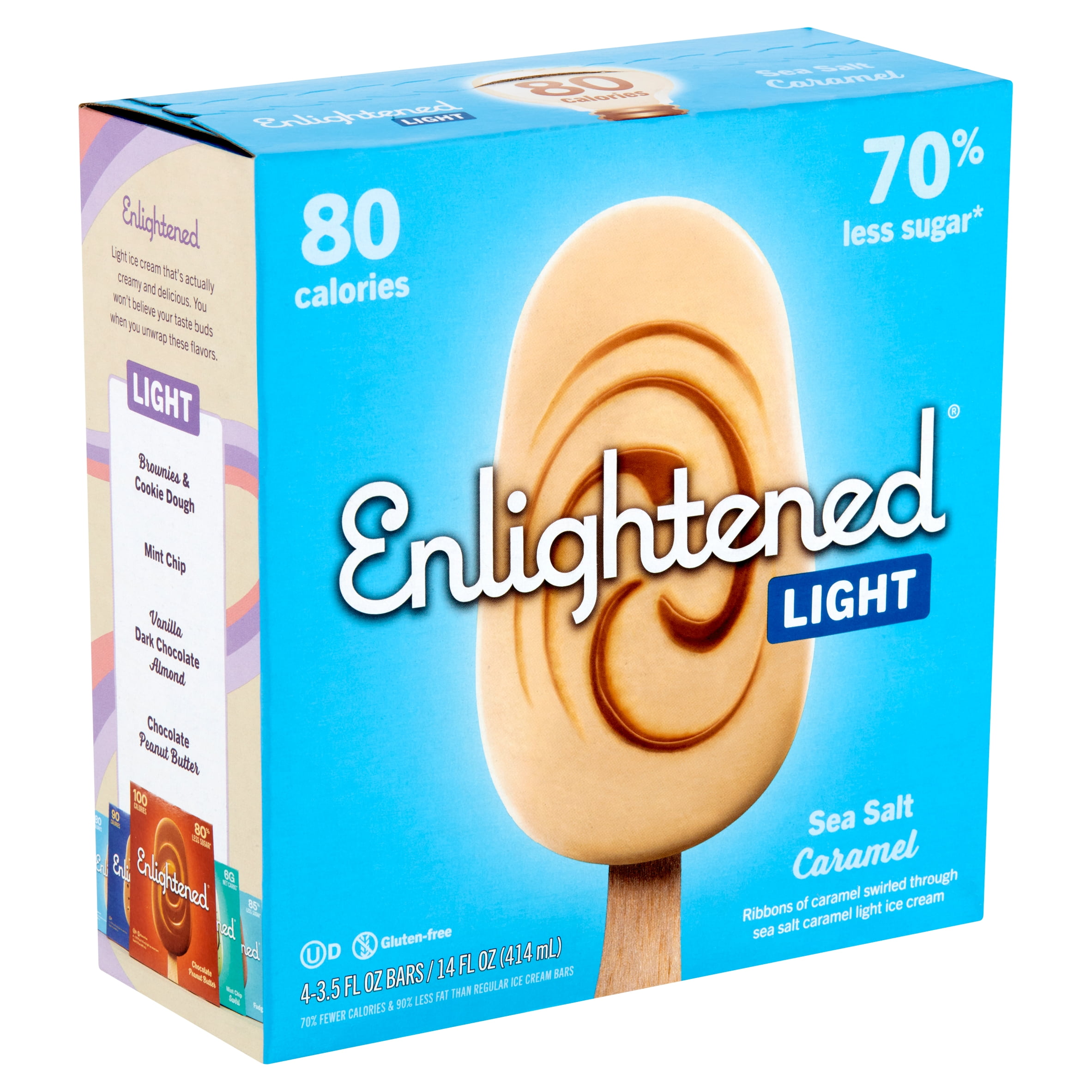 Sea Salt Caramel Ice Cream Bars | Enlightened Try Enlightened Sea Salt Caramel ice cream bars today! FIND IN STORES Order online $72.00 $80.00 Questions? Click here 8 Boxes (32 Bars) 1 Box (4 Bars) Qty Add to cart $48 minimum order Calories 80 Sugar 5g Fat 1.5g Net Carbs 5g Gluten-free Kosher *Nutrition facts are per serving. Nutrition & Ingredients Fewer Calories, More Flavor