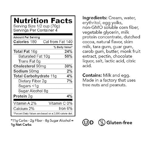Enlightened Keto Collection Dark Chocolate Ice Cream Bars Ingredients Cream, Water, Egg Yolks, Allulose, Non-GMO Soluble Corn Fiber, Dutched Cocoa, Erythritol, Milk Protein Concentrate, Vegetable Glycerin, Tara Gum, Guar Gum, Monk Fruit Extract, Salt. Safety warning Contains: milk and eggs. Made in a facility that uses tree nuts and peanuts.