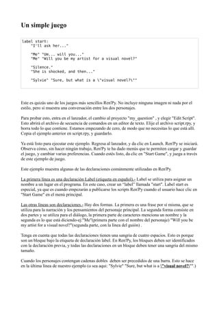 Renpy label. Text — Ren'Py Documentation WebText link. Ren'Py contains several ways of displaying text. The say and menu statements are primarily concerned with the display of text to the user. The user interface often contains text, displayed using the text, textbutton, and label screen language statements. These functions, along with others, create Text() displayables, and show them on the screen. ... RenPy - Visual Novel Engine - reddit Web15/01/2013 · RenPy - Visual Novel Engine r/ RenPy. Join. Posts Wiki. Hot. Hot New Top Rising. Hot New Top. Rising. card. card classic compact. 56. pinned by moderators. Posted by 2 years ago. New Subreddit CSS/Theme. 56. 10 comments. share. save. 33. Posted by 1 year ago. Meta /r/RenPy Discord. 33. 10 comments. share. save. 3. Posted by 6 hours … The Ren'Py Visual Novel Engine WebThe best places to ask questions about Ren'Py are the Lemma Soft Forums, the Ren'Py Discord, and the #renpy IRC channel. We make news about Ren'Py available on a number of social platforms: Twitter: You can follow Ren'Py's lead developer @renpytom for release announcements, development news, and general commentary on life. Quickstart — Ren'Py Documentation WebThe first line is a label statement. The label statement is used to give a name to a place in the program. In this case, we create a label named start. The start label is special, as it's where Ren'Py scripts begin running when the user clicks "Start Game" on the main menu. The other lines are say statements. There are two forms of the say ...