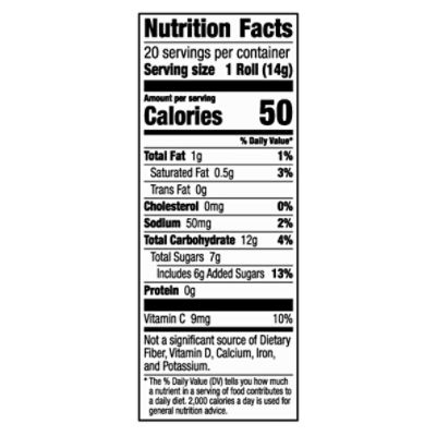 Fruit Roll-Ups Nutrition Facts & Calories - inlivo.com Nutrition Facts Fruit Roll-Ups Serving Size: 1 Roll (14g) * Amount Per Serving Calories 50 cal Calories from Fat 9 cal % Daily Value Total Fat 1 g 1.5% Saturated Fat 0 g Cholesterol 0 mg Sodium 50 mg Total Carbohydrate 11 g 3.7% Dietary Fiber 0 g 0% Sugars (Added) 0 g Protein 0 g 0% Vitamins Vitamin A 0 IU Vitamin B6 0 mg