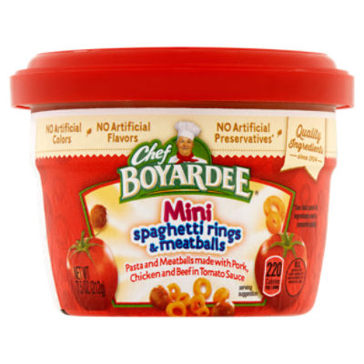 Chef Boyardee® Spaghetti & Meatballs, 14.5 oz - Kroger Each 14.5 oz, easy-open can of Chef Boyardee Spaghetti and Meatballs contains: 2 servings of meatballs, pasta, and tomato sauce 9 grams of protein 260 calories per serving With no artificial flavors, colors, or preservatives, Chef Boyardee makes a wholesome meal for kids of ALL ages. Nutritional Information OptUP® Nutrition Rating Learn More