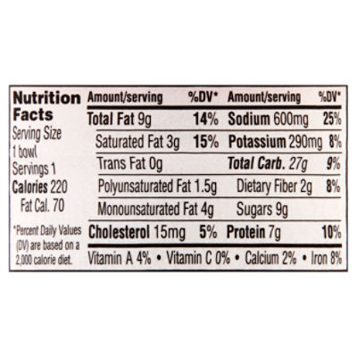 Nutrition facts for CHEF BOYARDEE Spaghetti and Meatballs ... Sodium 925mg 39%. Total Carbohydrate 30.6g 10%. Dietary Fiber 4g 14%. Sugars 7.6. Protein 11.2g. Vitamin A 0% • Vitamin C 3%. Calcium 3% • Iron 12%. * Percent Daily Values are based on a 2,000 calorie diet. Your daily values may be higher or lower depending on your caloric needs. Chef Boyardee Beef Ravioli Nutrition | livestrong Chef Boyardee Beef Ravioli has 7 grams of fat. Each gram of fat has nine calories, so 63 calories come from fat. There are 3 grams of saturated fat, about 14 percent of the daily recommended value. The USDA recommends a low saturated fat intake because saturated fat is linked to health issues such as cardiovascular disease. Protein Amazon.com: Chef Boyardee Spaghetti SpaghettiOs Original Canned Pasta, Healthy Snack for Kids and Adults, 22.4 OZ Can (Pack of 12) 22.4 Ounce (Pack of 12) 4.6 (1,903) $2199 ($0.08/Ounce) SNAP EBT eligible Chef Boyardee Jumbo Spaghetti and Meatballs, 14.5 oz, 12 Pack 14.5 Ounce (Pack of 12) 4.3 (5,651) $2136 ($0.12/Ounce) $20.29 with Subscribe & Save discount SNAP EBT eligible Spaghettios Calories, Carbs & Nutrition Facts | MyFitnessPal Chef Boyardee Spaghettios Serving Size: 1 cup 170 Cal 80% 33g Carbs 5% 1g Fat 15% 6g Protein Track macros, calories, and more with MyFitnessPal. Join for free! Daily Goals How does this food fit into your daily goals? Calorie Goal 1830 Cal 170/2000Cal left Fitness Goals: Heart Healthy Fat 66 g 1/67g left Sodium 1450 mg 850/2300mg left
