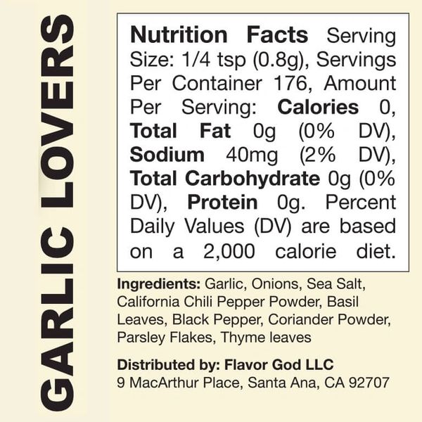 Calories in Everything Seasoning by Flavor God and Nutrition Facts Nutrition Facts ; Total Fat 0g ; Cholesterol 0mg ; Sodium 40mg ; Total Carbs 0g ; Protein 0g. Flavor God | Supplement King Sacrificing nutritional value has never been an option. The health of people and the foods we eat on a daily basis is what truly matters to the Flavor God Team!. Shortly after Chris created these seasonings, he began selling them at local farmers markets. The seasonings are crafted with care and shipped to countries all over the world.