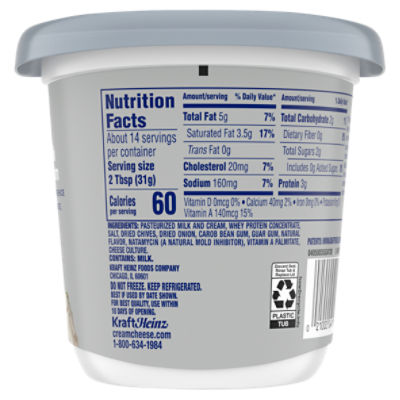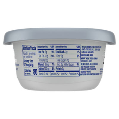Philadelphia cream cheese ingredient label. Calories in Philadelphia Regular Cream Cheese and Nutrition Facts Philadelphia Regular Cream Cheese Nutrition Facts Serving Size 2 tbsp (31 g) Amount Per Serving Calories 80 % Daily Values* Total Fat 7.00g 9% Saturated Fat 4.500g 23% Trans Fat 0.000g Cholesterol 20mg 7% Sodium 125mg 5% Total Carbohydrate 2.00g 1% Dietary Fiber 0.0g 0% Sugars 1.00g Protein 2.00g Vitamin D - Calcium - Iron - Potassium - Philadelphia finally debuts vegan cream cheese in the US Food giant Kraft Heinz has finally launched a vegan version of its Philadelphia cream cheese in the US. The highly-anticipated product debuted at select retailers in the southeast, with more flavours planned for a national rollout in the summer. Made from coconut oil, the vegan cream cheese is free from gluten and boasts a 'creamy, spreadable ... Philadelphia Original Cream Cheese, 8 oz Nutrition Facts Contains a moderate amount of risky components that may include saturated fat, cholesterol, sodium and sugars (0.02%/oz). Good source of proteins (31% of DV/100g). This item has no fiber content (0% of DV/100g). Calories in 1 Cup (8.8 oz) 263 calories / 23 from fat Carbohydrates 19 g Proteins 39 g Fat 2.5 g Saturated Fat 1.6 g Calories Nutrition Philadelphia Original Cream Cheese Nutrition Facts A serving of Philadelphia Original Cream Cheese contains 5 Weight Watchers SmartPoints, 3 PointsPlus and 5 SmartPoints. ... Philadelphia Original Cream Cheese Ingredients. Philadelphia Original Cream Cheese contains the following ingredients: Pasteurized milk and cream, whey protein concentrate, salt, carob bean gum, cheese culture. SHARE.