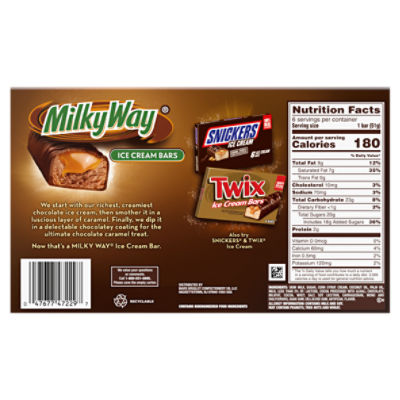 Milky Way - Home - Facebook Milky Way. 1,998,186 likes · 171 talking about this. Get lost in eating a MILKY WAY. #MmmmSorry Save on Milky Way Candy Bar Order Online Delivery | Stop & Shop Single Size Milky Way Milk Chocolate Per pack: 240 Calories. 6g Sat fat, 30% DV. 70mg Sodium, 3% DV. 32g Total sugars. We value your Questions or Comments, Call 1-800-551-9985. Visit: . Manufacturer Mars Wrigley Confectionary Address Hackettstown, NJ 07840-1503 USA Phone 1-800-551-9985 MILKY WAY Bar nutrition facts and analysis. MILKY WAY Bar contains 2.8 g of saturated fat and 2.1 mg of cholesterol per serving. 23 g of MILKY WAY Bar contains 7.13 mcg vitamin A, 0.2 mg vitamin C, 0.09 mcg vitamin D as well as 0.11 mg of iron, 26.45 mg of calcium, 29 mg of potassium. MILKY WAY Bar belong to 'Candy containing chocolate' food category. Milky Way Candy Bar: Calories, Nutrition Analysis & More - Fooducate Nutrition Serving Size: 2 bars Amount per Serving My Daily Value Calories 180 Kcal 11% Total Fat 7 g 11% Saturated Fat 3.5 g 21% Cholesterol 5 mg 2% Sodium 65 mg 3% Total Carbohydrate 28 g 12% Dietary Fiber 0 g 0% Sugars 24 g 34% Added Sugars 24 g 100% Protein 2 g 4% Calcium 40 mg 4% Ingredients