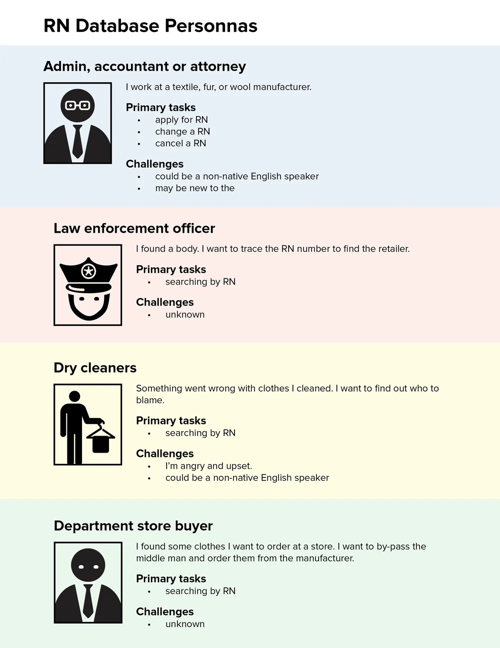 RN Database — TJ Peeler RN Database. a website redesign, 2015-2016 . Project Goal. To improve the design of the FTC's Registered Identification Number (RN) Database. Textile manufacturers can apply online to the FTC for an identification number to use on clothing labels. Project Team. I joined a team of 2 in-house experts and a project manager. We are working with a ...